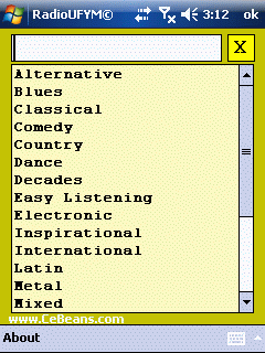 This program is a database of 22 Genres on the www.ufym.net website with direct search links. Start typing the genre to browse the genre list and tap on the genre to view the stations. NOTE: You need TCPMP or CorePlayer for these streams. This service is provided by www.ufym.net